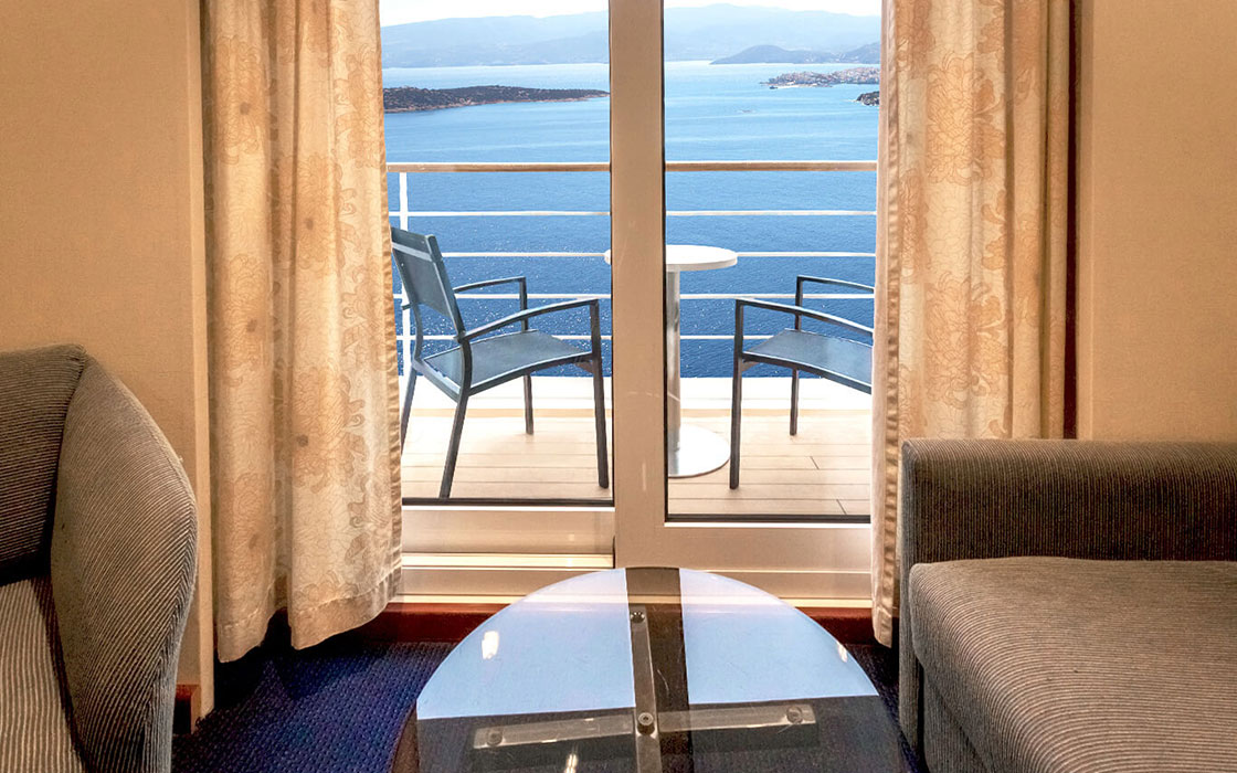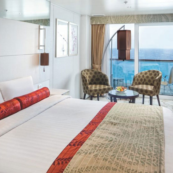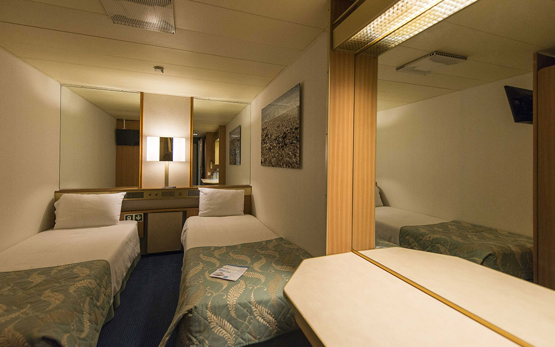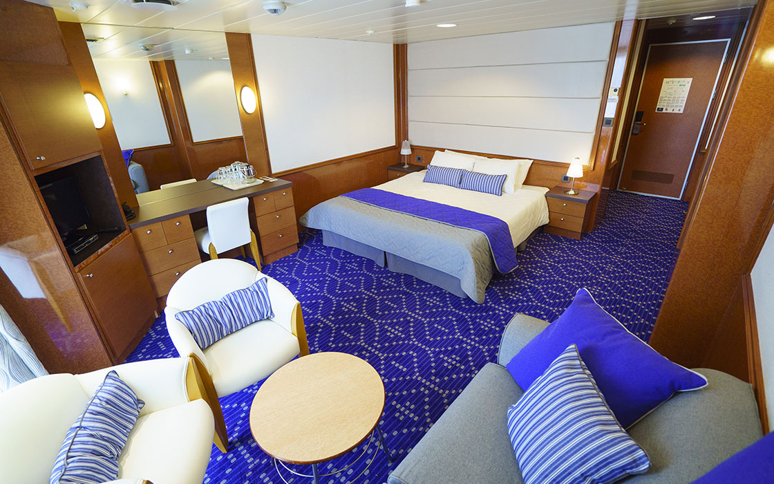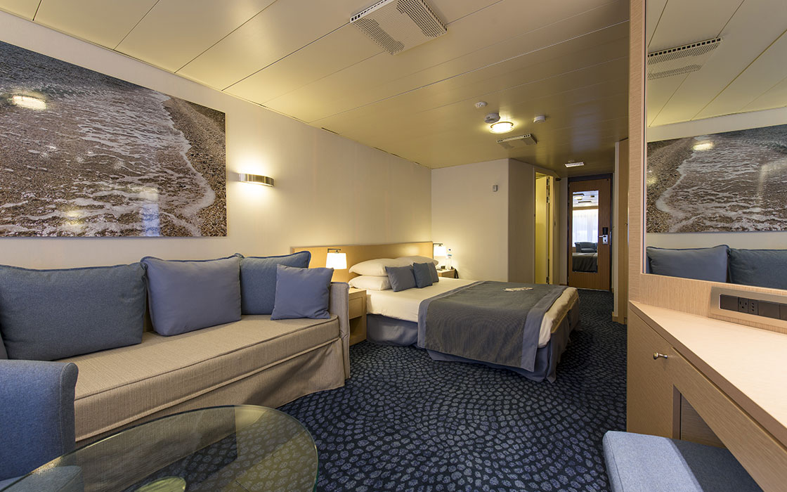 Los acogedores camarotes se han diseñado para satisfacer a todos nuestros viajeros. Recibirás toallas limpias y productos de aseo dos veces al día y el encargado de tu camarote te proporciona servicio de habitaciones las 24 horas para asegurarse de que tienes todo lo que necesita. Los camarotes son cómodos e incorporan aire acondicionado regulable, secador, caja fuerte y televisión. Además, las suites cuentan con un minibar refrigerado, una sala de estar adicional y balcón.