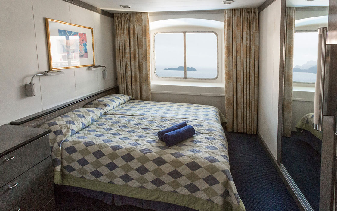 Los acogedores camarotes se han diseñado para satisfacer a todos nuestros viajeros. Recibirás toallas limpias y productos de aseo dos veces al día y el encargado de tu camarote te proporciona servicio de habitaciones las 24 horas para asegurarse de que tienes todo lo que necesitas. Los camarotes son cómodos e incorporan aire acondicionado regulable, secador, caja fuerte y televisión. Además, las suites cuentan con un minibar refrigerado, una sala de estar adicional y balcón.