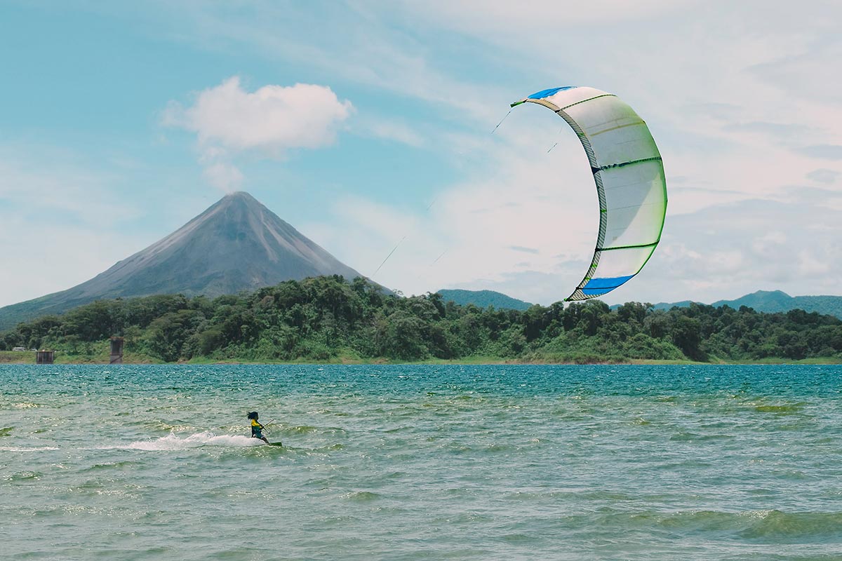 Si eres amante de los deportes acuáticos y te gustan las emociones fuertes, no puedes dejar la oportunidad de practicar tu deporte favorito en un entorno privilegiado, rodeado de una espesa selva tropical y con el imponente volcán Arenal como telón de fondo. Estamos hablando del lago más grande del país, el lago Arenal, que cuenta con vientos de más de 25 nudos desde mediados de noviembre hasta mediados de abril. El viento es tan regular que está considerado uno de los mejores lagos del mundo para practicar kitesurf.