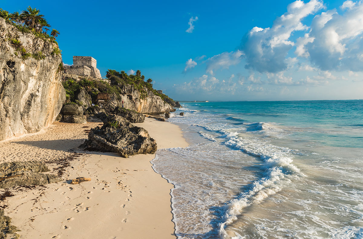 Tulum es uno de los recintos arqueológicos más visitados de todo México. Se encuentra situado en una ciudad fortificada que se sitúa sobre un acantilado frente al mar a 130 km. al sur de Cancún. Esta majestuosa ciudad Maya se consolidó como uno de los enclaves marítimos de comercio costero más importantes a lo largo de la costa conectando Centroamérica con el Golfo de México.